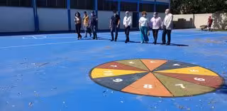 En el interior se ha reformado la superficie del patio de recreo, donde se ha sustituido la antigua base por una nueva de cemento pulido de base azul con diferentes motivos y propuestas de juegos tradicionales y deportes en llamativos colores.