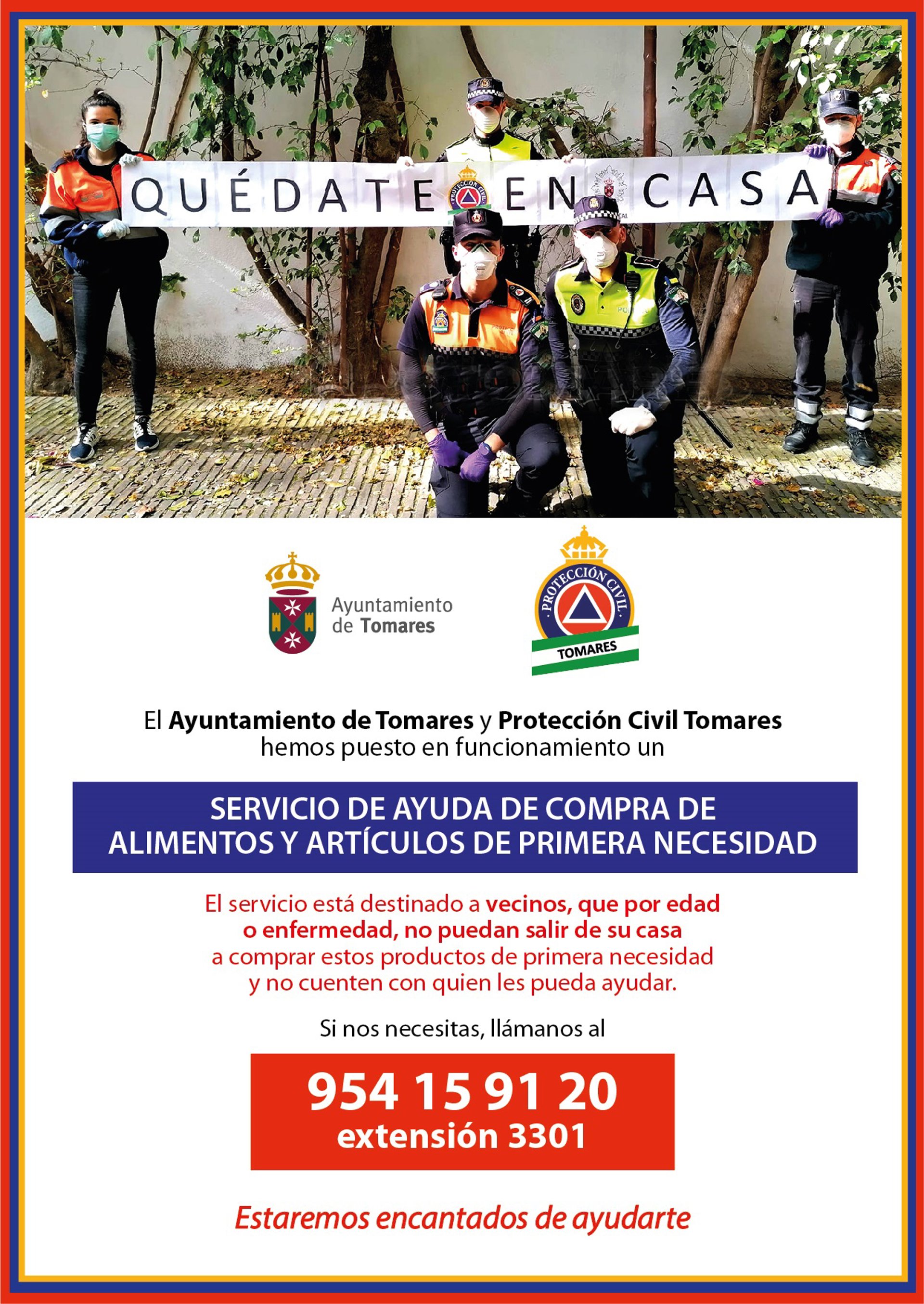 El Ayuntamiento de Tomares y Protección Civil de Tomares, pensando en las personas más vulnerables y que estén completamente solas, han puesto en marcha un servicio municipal de ayuda a domicilio para la compra de alimentos y artículos de primera necesidad destinado a personas que por enfermedad o por estar en cuarentena, estén totalmente aisladas y no cuenten con ningún familiar o vecino cercano que les pueda echar una mano para comprar lo imprescindible, evitando así que tengan que salir de casa.