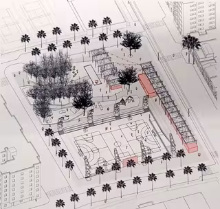 Alrededor de esta vía se dispondrán secuencialmente distintos usos lúdico deportivos. En primer lugar, las dos actividades destinadas a los jóvenes, un skatepark y un boulder, actividades específicas que necesitan un espacio acotado y diferenciado del resto para no producir interferencias funcionales. Y en el epicentro de la ordenación, el lugar donde confluyen todos los espacios y en el que se sitúa bajo una pérgola el kiosco-bar desde donde se observan la zona infantil; zona de mayores y un gimnasio urbano.