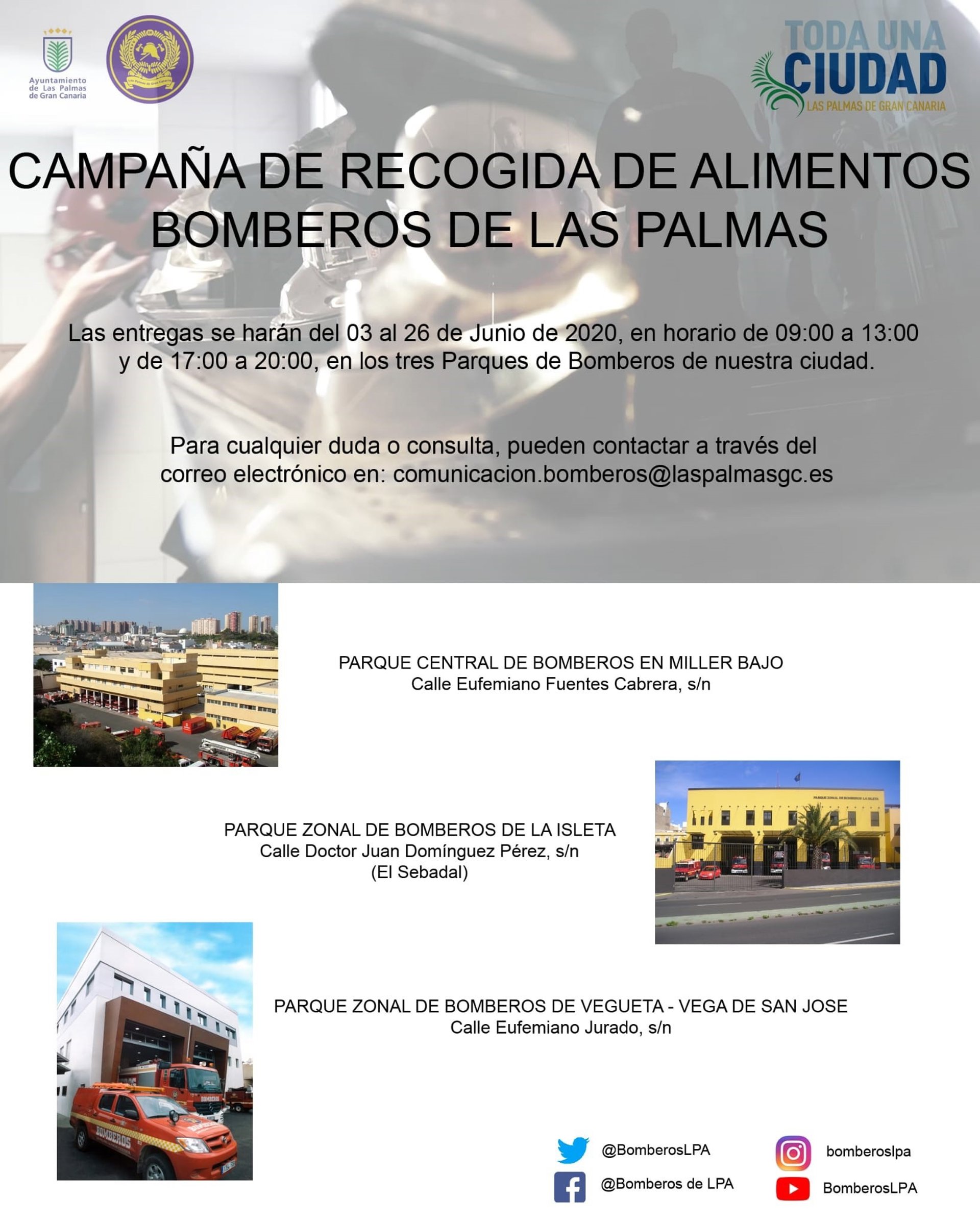 La campaña está dirigida a todas las personas que deseen hacer donaciones de alimentos envasados no perecederos, pudiéndolo entregar en los parques de bomberos de Miller Bajo (C/Eufemiano Fuentes Cabrera s/n), en el Parque Vegueta (C/Eufemiano Jurado s/n) y en el Parque Isleta (C/Dr. Juan Domínguez Pérez s/n), según informó el SEIS en nota de prensa.
