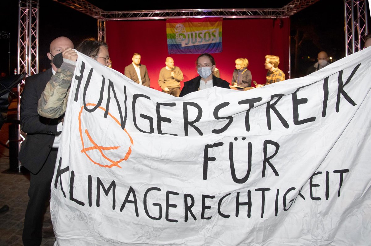 17 September 2021, Brandenburg, Potsdam: Climate activists hold a banner reading "Hunger strike for climate justice" at an election campaign event of Olaf Scholz, German Minister of Finance and Candidate for Chancellor of the Social Democratic Party (SP - Paul Zinken/dpa