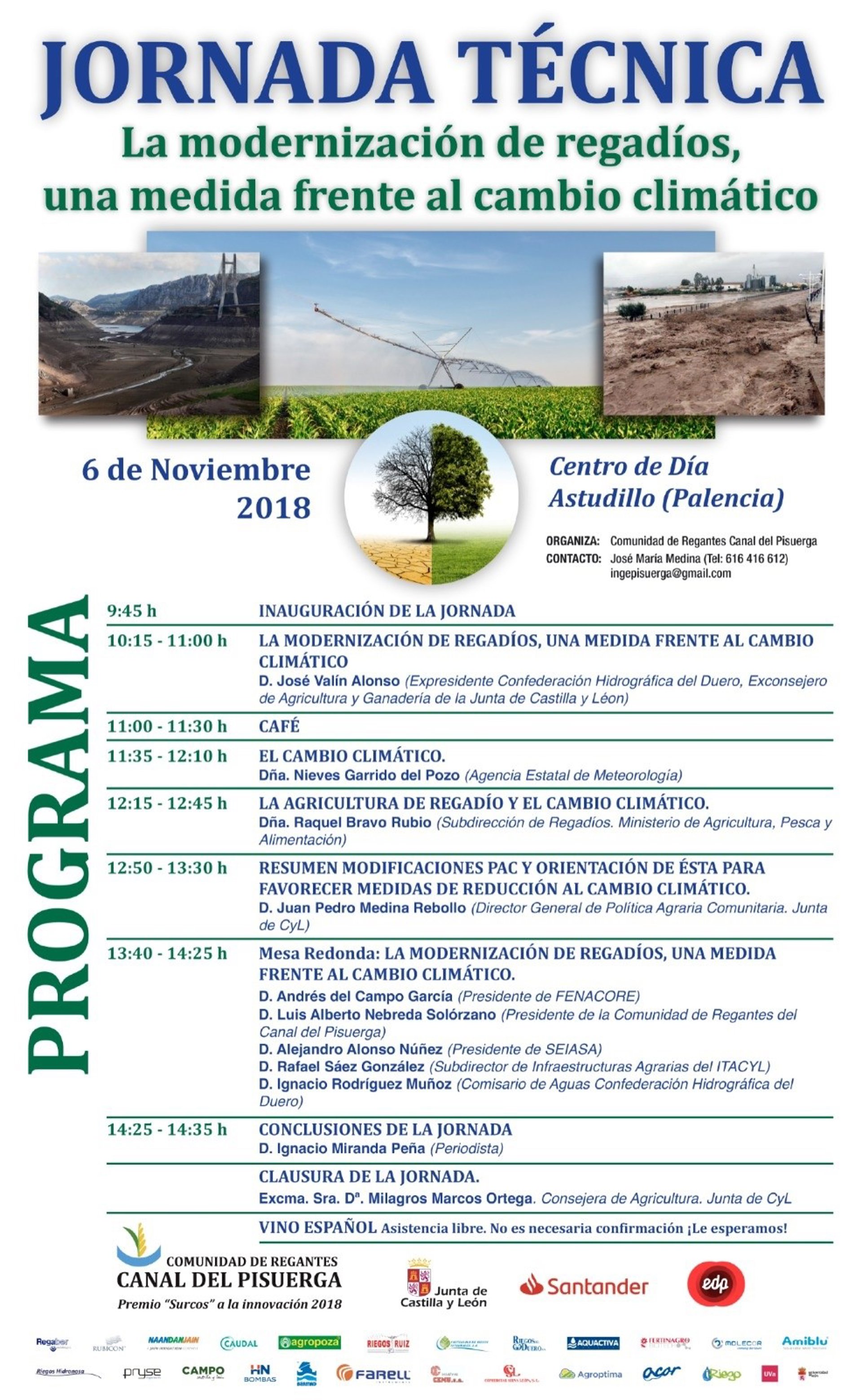 La modernización e innovación en los sistemas de regadío para lograr un mejor aprovechamiento del agua ante los efectos del cambio climático conforman el eje sobre el cual versará la jornada técnica que, organizada por la Comunidad de Regantes Canal del Pisuerga, tendrá lugar el próximo martes, 6 de noviembre, en la localidad palentina de Astudillo, con la presencia de diferentes especialistas en la materia.