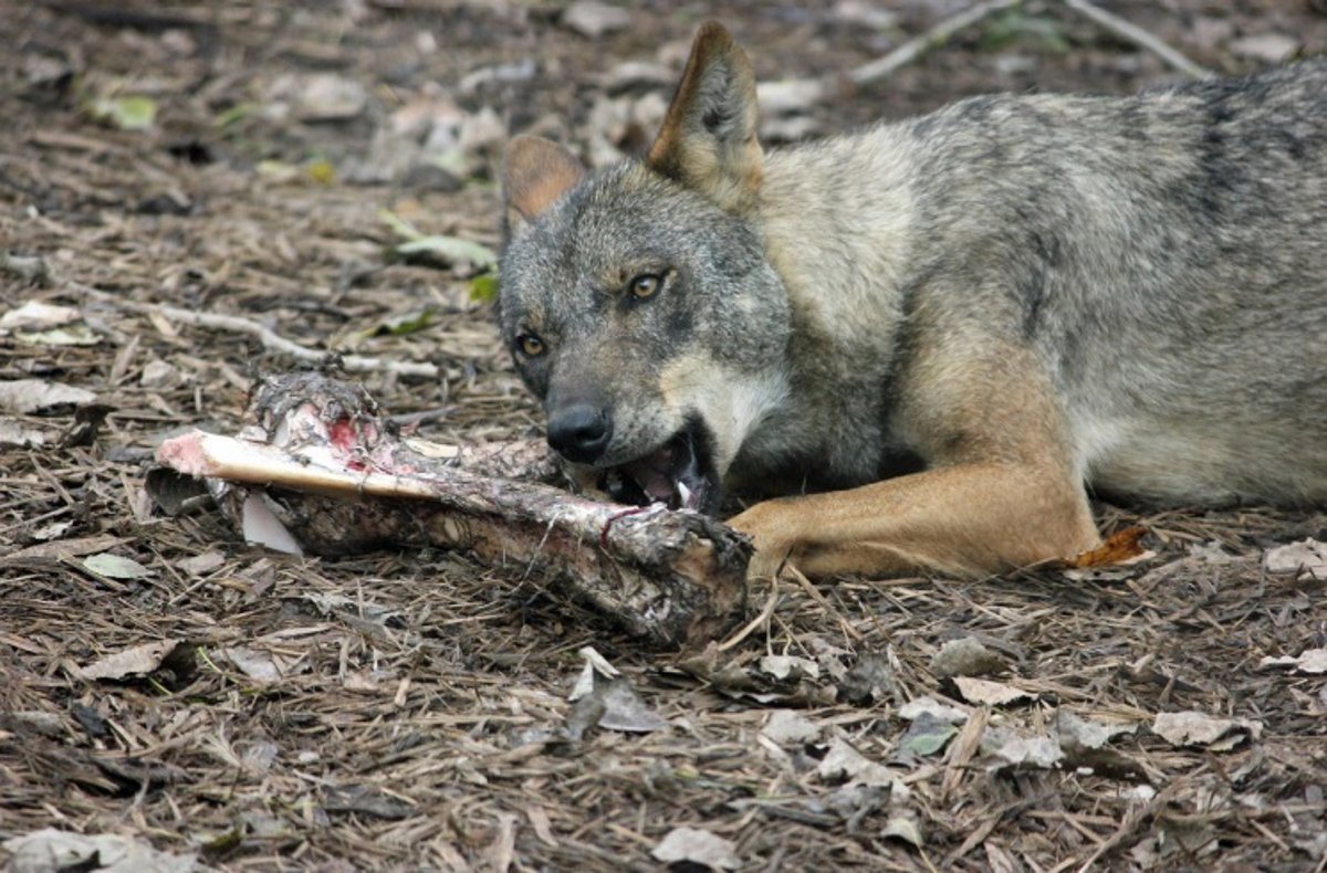 Archivo - Un lobo come los restos de un animal.