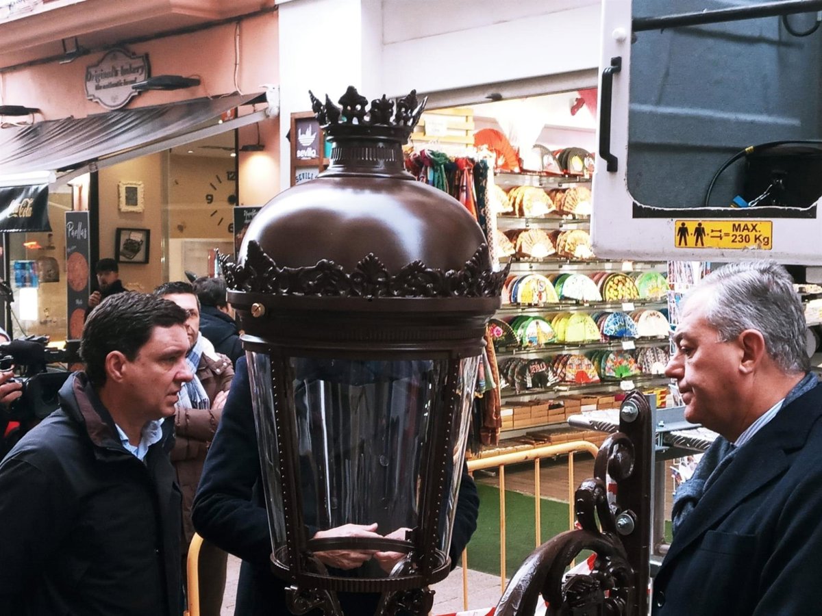 El Ayuntamiento de Sevilla ha comenzado este jueves la instalación de farolas de tipo 'fernandina' en la calle Sierpes, que sustituirán las luminarias "de carretera" que aún existen en esta céntrica vía comercial. Se trata de una actuación enmarcada en un proyecto que contempla 804 nuevos puntos de luz en 68 calles, con una inversión de 734.000 euros, "que va a mejorar la eficiencia energética y el sistema de telegestión del alumbrado público con estas lámparas LED".
