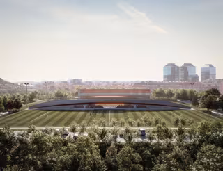 El diseño se integra en el paisaje de la montaña de Montjuïc e implica sostenibilidad y eficiencia energética, para conseguir unas instalaciones Nearly Zero Energy Building (NZEB) y energéticamente autosuficientes; el consumo será 100% eléctrico e incluirá placas fotovoltaicas, y se optimiza el consumo de agua con un depósito para almacenar la lluvia, que regará los campos de fútbol y el entorno.