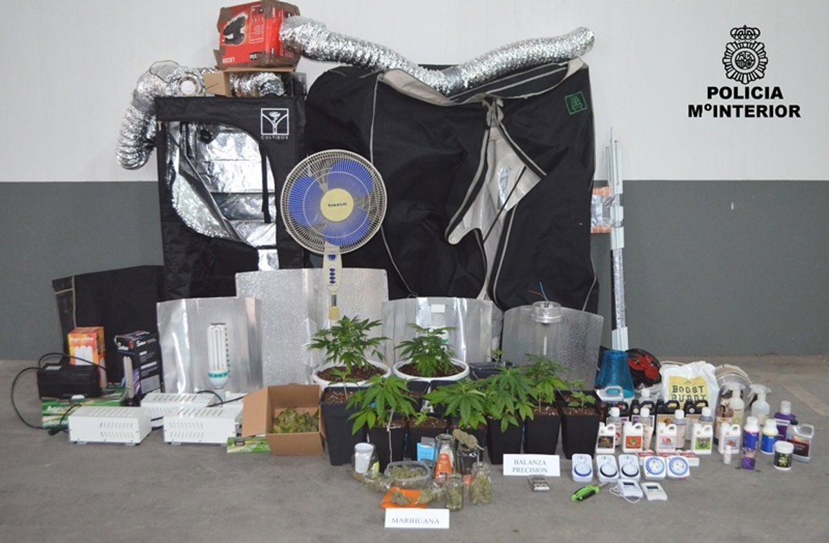 La Policía Nacional intervino 15 plantas de marihuana, 112 gramos de sustancia herbácea (cogollos y hojas) así como numerosos instrumentos de los utilizados para el cultivo de marihuana en lugares cerrados: dos armarios de tela para cultivo, filtros de aire, humidificador, ventiladores, termómetro, fertilizantes, lámparas, campana extractora de humos, temporizadores, etc.
