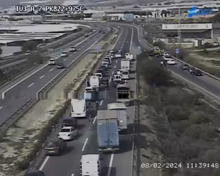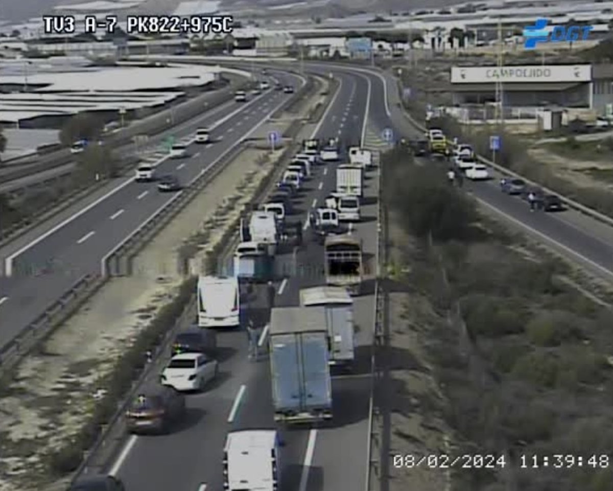 Uno de los cortes de tráfico durante las protestas de los agricultores en la A-7 a su paso El Ejido (Almería). - DGT