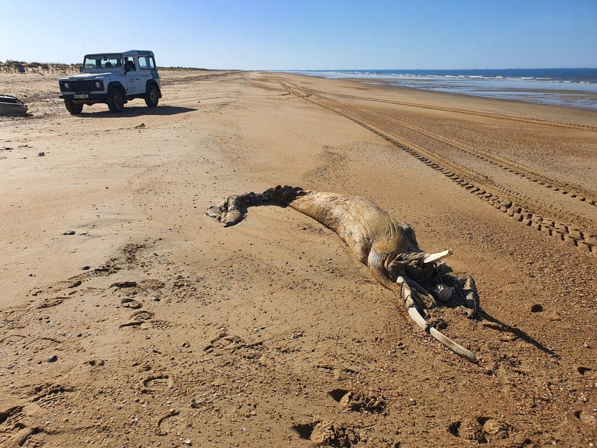 Cadáver de la ballena varada en El Espigon (Huelva). - AYUNTAMIENTO DE HUELVA