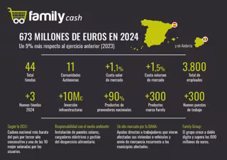 Family Cash ha cerrado el ejercicio 2024 con una facturación neta de 673 millones de euros, lo que representa un 9% más que el ejercicio anterior, según ha informado la cadena de hipermercados valenciana en un comunicado.
