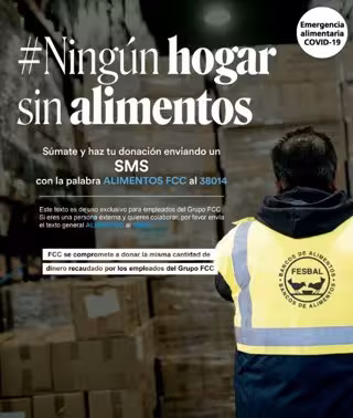 El Grupo FCC se ha sumado a la campaña solidaria en favor de los bancos de alimentos 'Ningún hogar sin alimentos' puesta en marcha por La Fundación 'la Caixa' y CaixaBank que pretende ayudar a las familias vulnerables, cuya situación se ha visto agravada por la crisis sanitaria causada por el Covid-19.