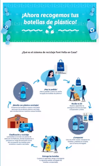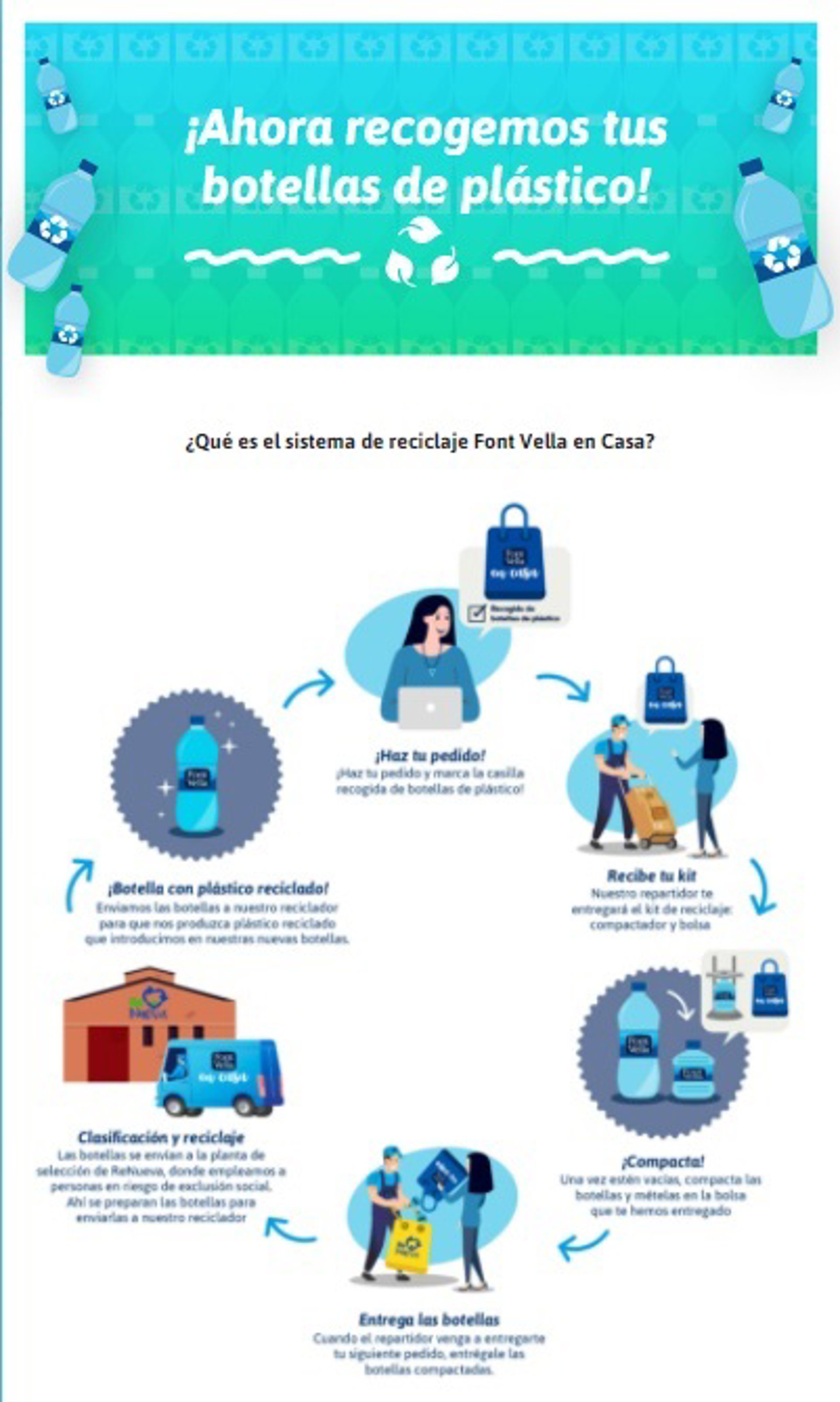 La plataforma de venta online y entrega a domicilio de Aguas Danone España, Font Vella en Casa ('www.fontvellaencasa.es'), ha presentado un nuevo servicio de recogida de las botellas que sirve a sus clientes para ayudar en su reciclaje. El objetivo, en pro de la economía circular, es asegurar la recuperación de esas botellas y darles una segunda vida en forma de plástico reciclado en nuevas botellas.