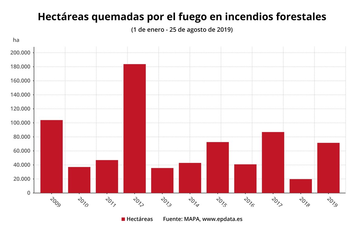 La cifra de 2019 es superior (4.458,45 hectáreas más) a la media de la década (67.028,35) y, además, este año se posiciona como el quinto peor año de los últimos diez, por detrás de 2012, cuando se quemaron 183.736,11 hectareas; 2009, con 103.956,12 hectáreas; 2017, 86.913,00 hectáreas y 2015, con 72.599,58 hectáreas afectadas hasta el 25 de agosto.