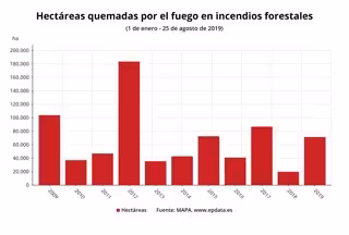 El fuego ha arrasado un total de 71.486,80 hectáreas de superficie en lo que va de año, hasta el 25 de agosto, lo que supone casi el cuádruple que en el mismo periodo de 2018, con 19.769,69 hectáreas, y que sitúan ya a 2019 como el quinto peor año del decenio en cuanto a incendios forestales, según datos actualizados del Ministerio de Agricultura, Pesca y Alimentación (MAPA).
