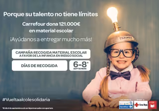 En la pasada edición de la 'Vuelta al Cole Solidaria', fruto de la donación directa realizada por la Compañía y las aportaciones realizadas por los ciudadanos, Fundación Solidaridad Carrefour entregó a Cruz Roja material escolar por valor de 584.282 euros. Importe que, se estima, sirvió para dar cobertura a las necesidades en esta materia de más de 15.000 niños en situación de vulnerabilidad de toda España.