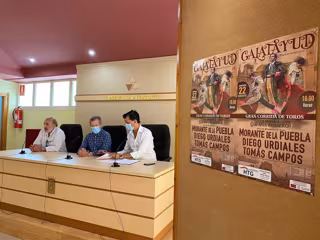 El alcalde de Calatayud, José Manuel Aranda, y el empresario organizador del festejo, Ignacio Ríos, han presentado el cartel este jueves, 19 de agosto, en la Plaza de Toros de la Misericordia de Zaragoza. Se trata del primer festejo taurino que se celebra en Aragón desde el inicio de la pandemia.