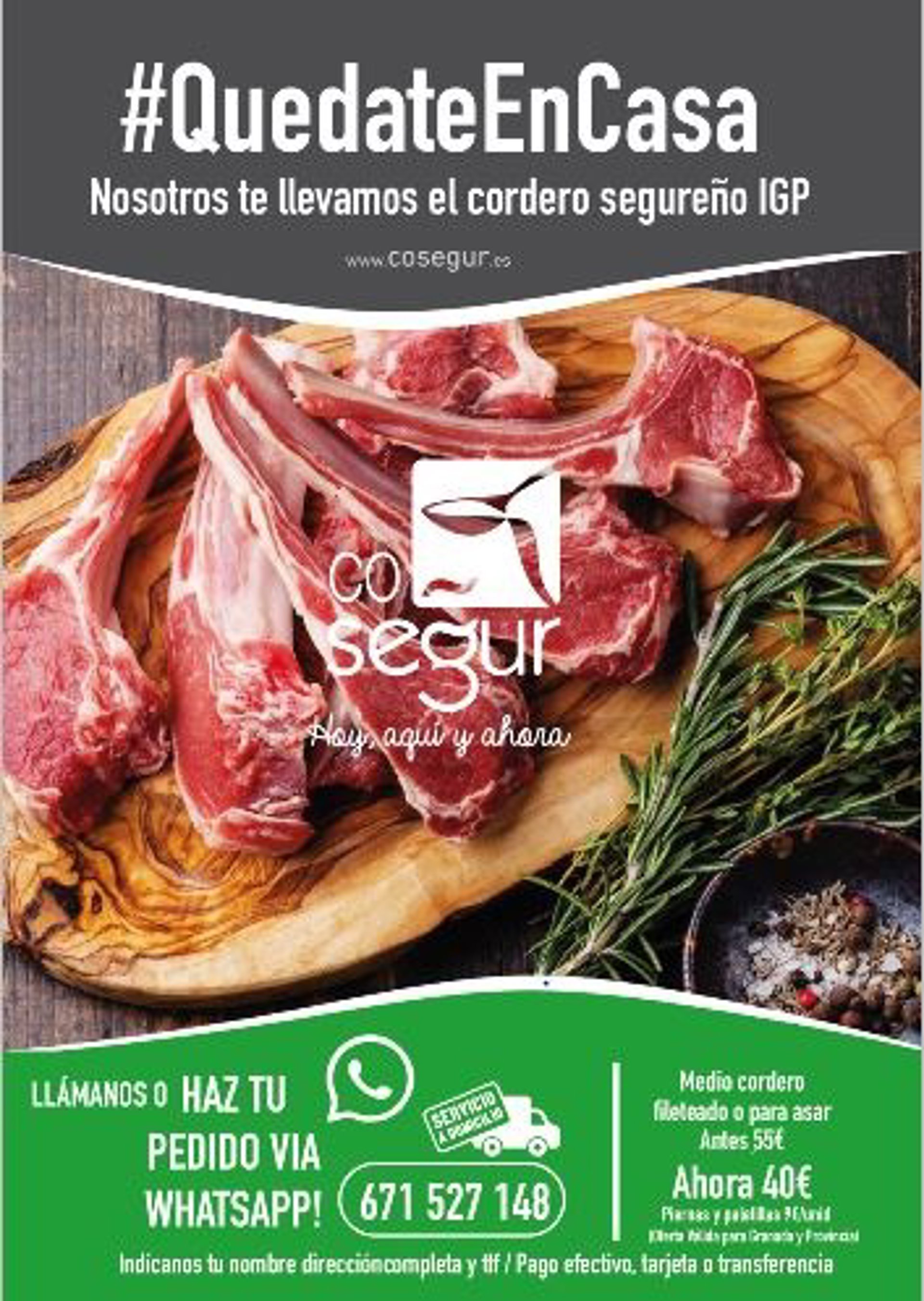 La Cooperativa Cosegur, en Huéscar (Granada), ha puesto en marcha una campaña para la venta directa de Cordero Segureño de Indicación Geográfica Protegida (IGP) que permite al consumidor hacer sus pedidos por teléfono o través de whatsapp y recibirlo en su domicilio, una iniciativa que buscar apoyar a los ganaderos y minimizar las pérdidas en el sector derivadas de la crisis del coronavirus.