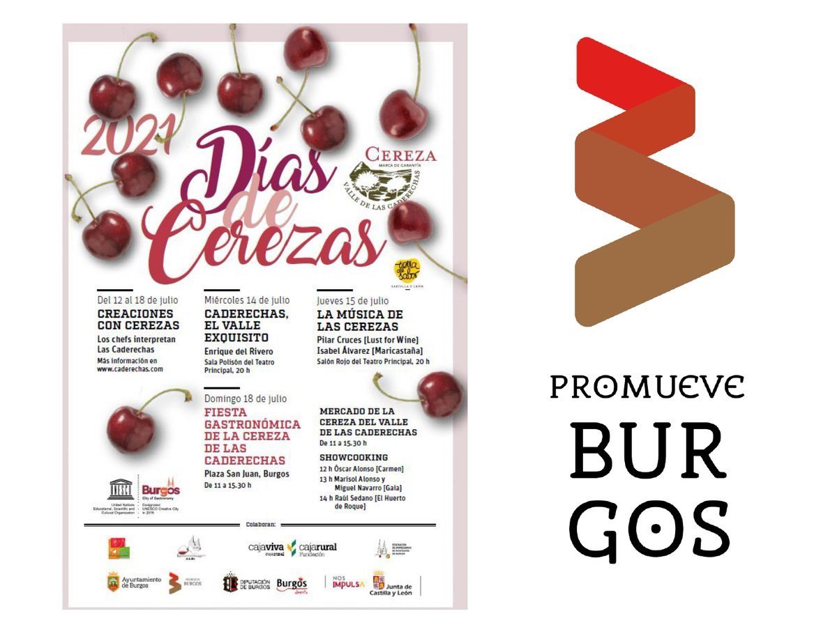 La Marca de Garantía Cereza del Valle de las Caderechas, con el apoyo de Promueve Burgos a través de 'Burgos Ciudad Creativa de la Gastronomía', celebra por segundo año consecutivo los 'Días de cerezas' en el que 10 restaurantes de la capital ofrecen hasta el 18 de julio menús elaborados con la cereza del Valle de las Caderechas como producto "estrella".