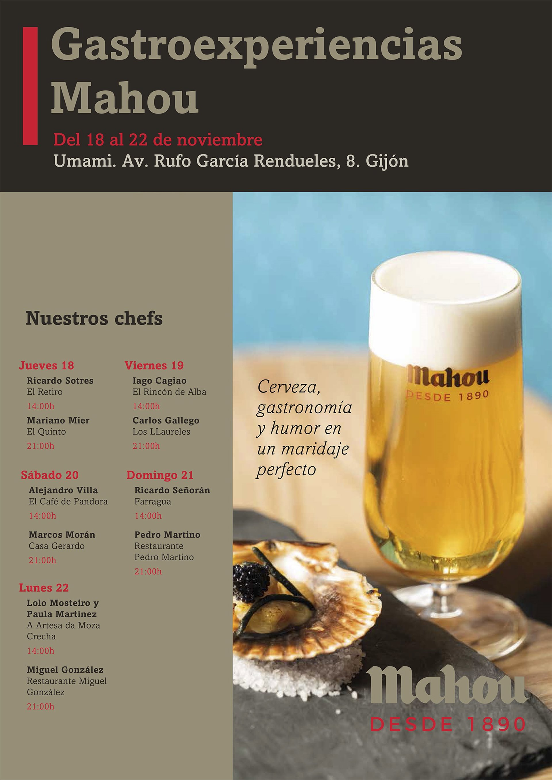 Las 'Gastroexperiencias Mahou', tendrán lugar del 18 al 22 de noviembre en Umami, en la calle Rufo García Rendueles, 8 de Gijón y contarán con los chefs Marcos Morán (Casa Gerardo), Mariano Mier (El Quinto), Ricardo Sotres (El Retiro), Ricardo Señorán (Farragua), Carlos Gallego (Los Llaureles), Alejandro Villa (El Café de Pandora), Pedro Martino (Restaurante Pedro Martino), Iago Cagiao (El Rincón de Alba), Lolo Mosteiro y Paula Martínez (A Artesa da Moza Crecha), y Miguel González (Restaurante Miguel González).