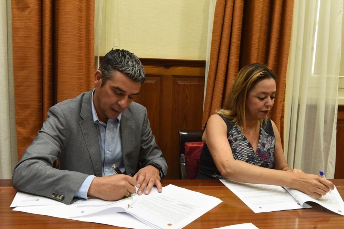 El consejero de Agricultura, Ganadería, Pesca y Aguas del Gobierno de Canarias en funciones, Narvay Quintero, y la presidenta del Cabildo de Lanzarote, María Dolores Corujo, han firmado el convenio que permitirá mejorar la red de saneamiento de Costa Teguise, con una inversión prevista de más de 1,3 millones de euros.