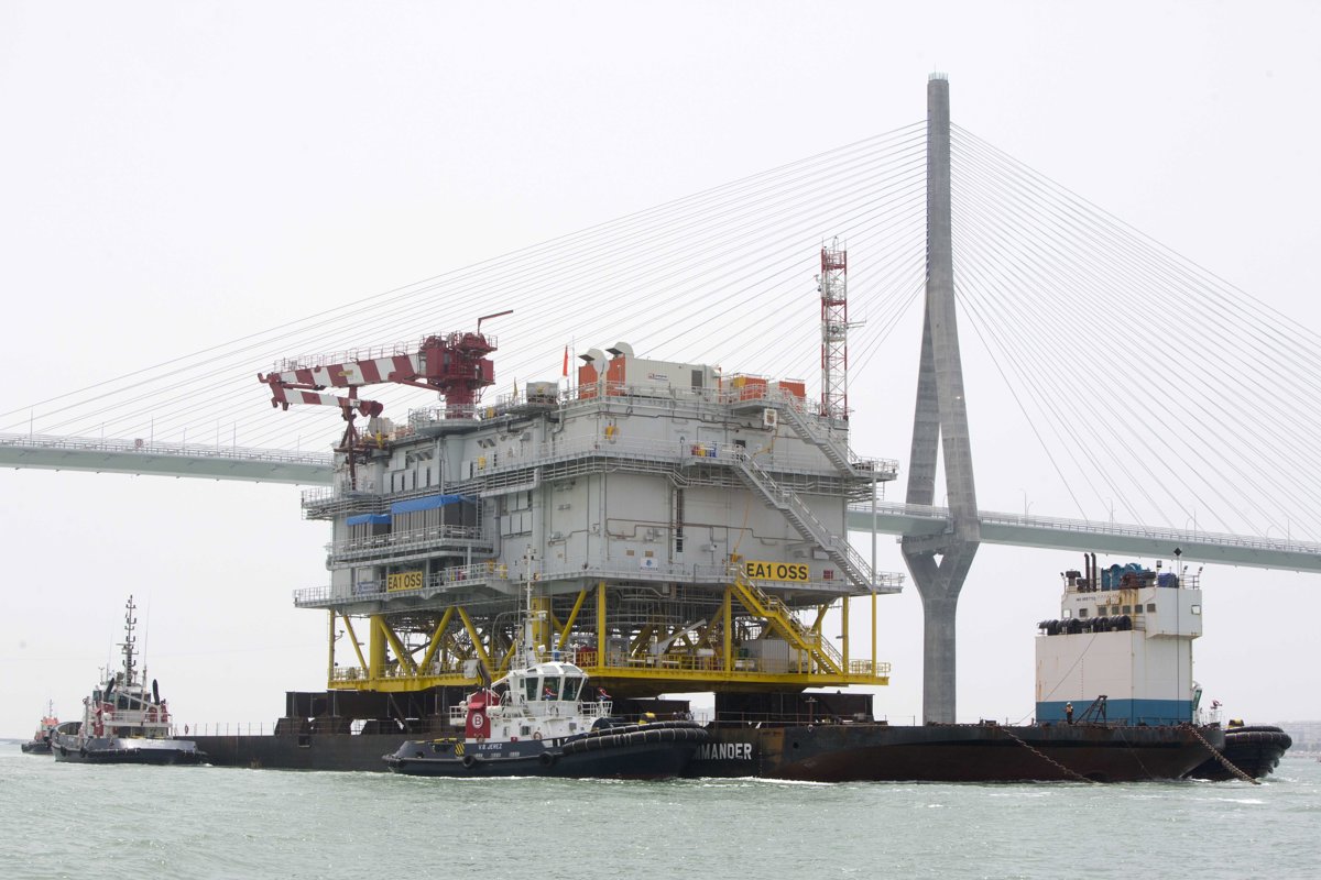 La subestación 'Andalucía II' ha iniciado este sábado su travesía marítima desde el astillero de Puerto Real (Cádiz) con destino al parque eólico marino East Anglia One que Iberdrola levanta en aguas británicas.