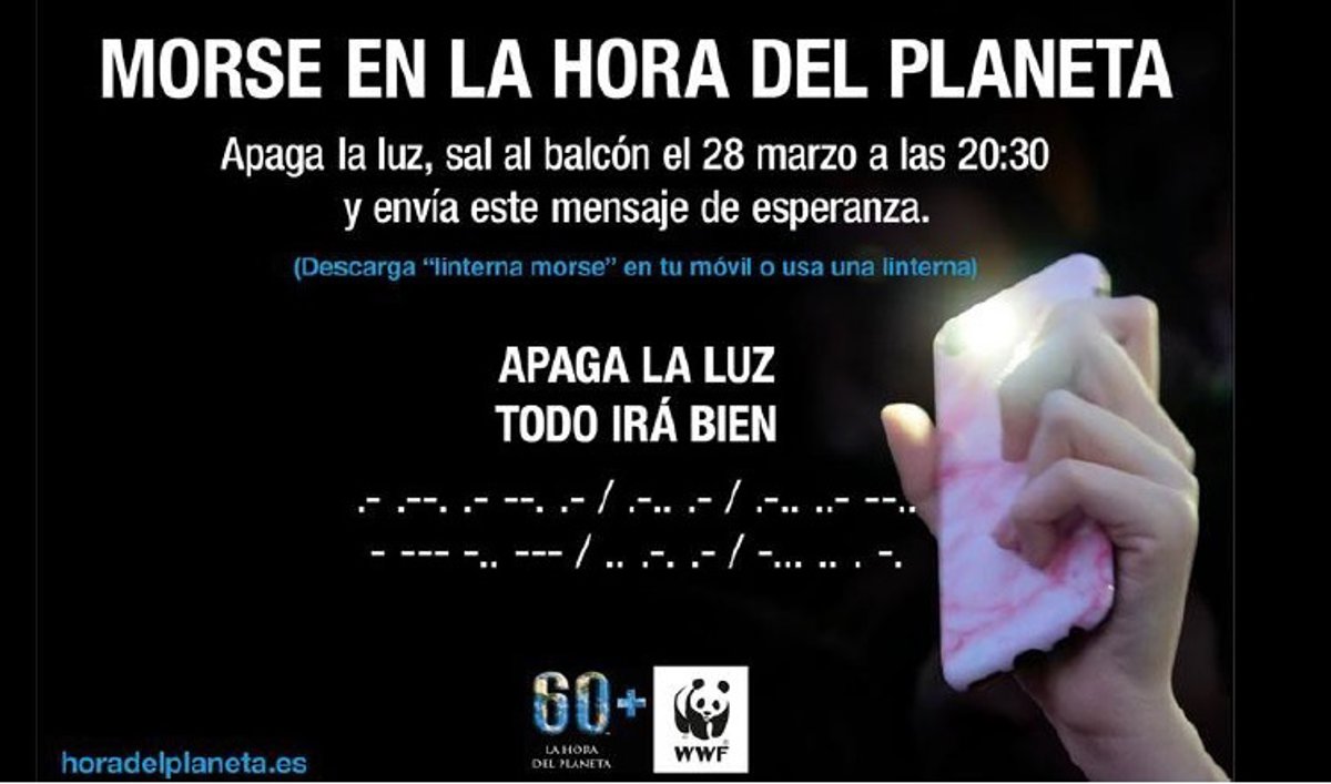 La iniciativa, que este año cuenta con el apoyo de más de 250 ayuntamientos y más de 170 organizaciones, está marcada en esta ocasión por el Estado de Alarma en España para frenar la expansión del coronavirus por lo que se celebrará desde casa, sin actos multitudinarios, pero a la misma hora, las 20.30 horas, cuando WWF pide salir a las ventanas y lanzar en morse con linternas el mensaje "Apaga la luz. Todo irá bien".