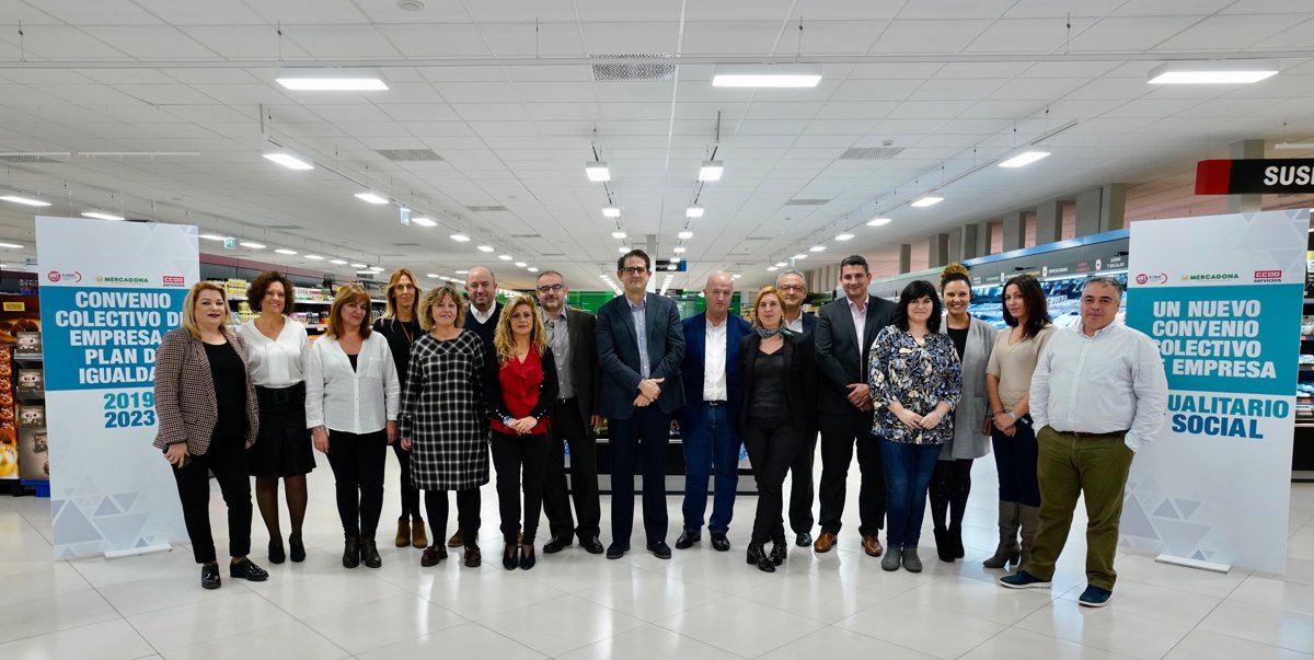 Mercadona y los sindicatos UGT y CCOO han firmado este martes el nuevo convenio colectivo de empresa y el Plan de Igualdad, que entrarán en vigor el 1 de enero de 2019 y tendrán una duración de cinco años. El acuerdo establece un sueldo base mínimo de 1.300 euros brutos al mes y una ampliación del permiso de paternidad hasta las siete semanas, frente a las cinco que marca la ley.