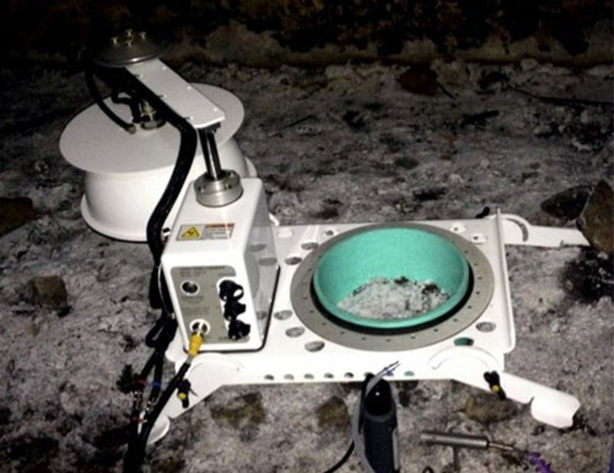 El equipo de medición in situ de flujos de intercambio de gases de efecto invernadero entre los sedimentos bicolonizados y la atmósfera subterránea. El sistema combina en serie las cámaras de medición de intercambio de gases y espectrómetros con tecnologías Cavity Ring-Down (CRDS) y de infrarrojos por transformada de Fourier (FTIR), ubicadas en diferentes puntos de la cueva.