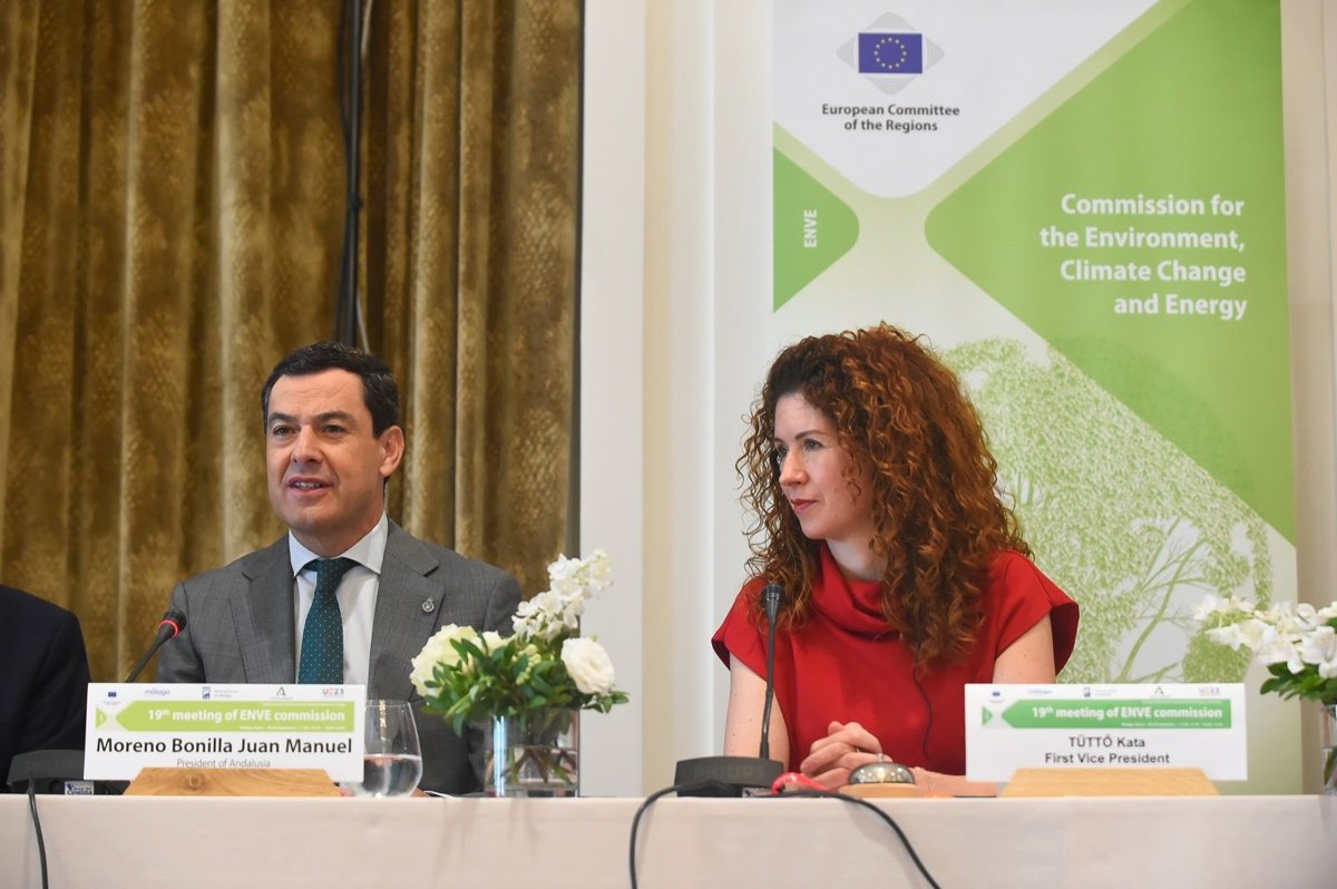 El presidente del Gobierno andaluz, Juanma Moreno, en la segunda jornada de la reunión de la Comisión de Medio Ambiente, Cambio Climático y Energía (ENVE) del Comité Europeo de las Regiones junto a la vicepresidenta de la comisión, Kata Tütto. - EUROPA PRESS