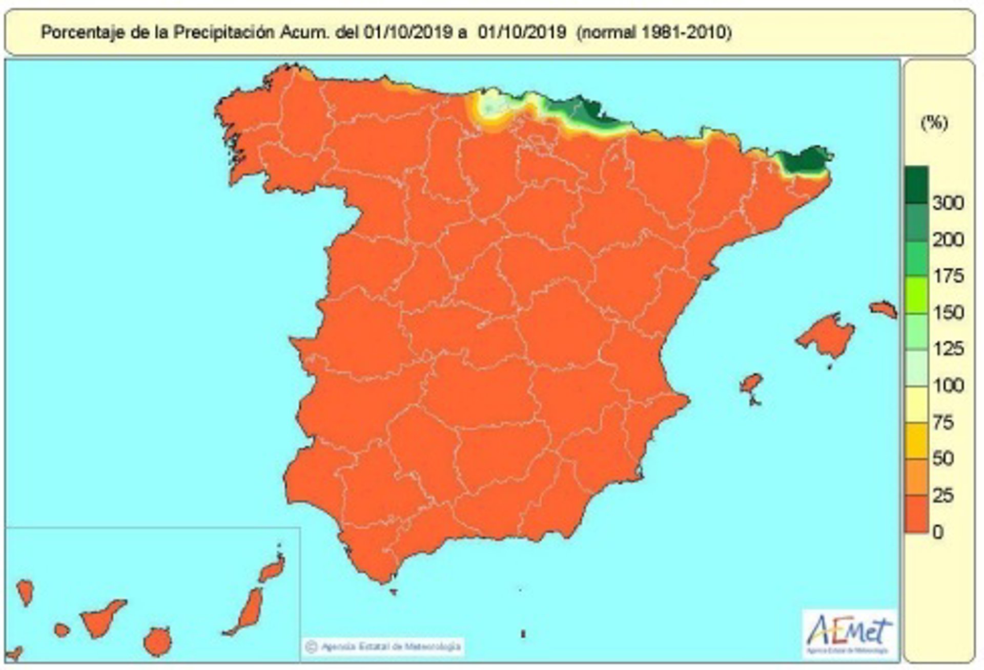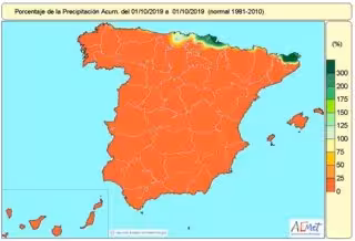 Con estas cifras, el año hidrológico comienza con cantidades por debajo de las normales en toda España excepto en una franja que va desde el este de Cantabria hasta Navarra y en la mitad norte de la provincia de Gerona.