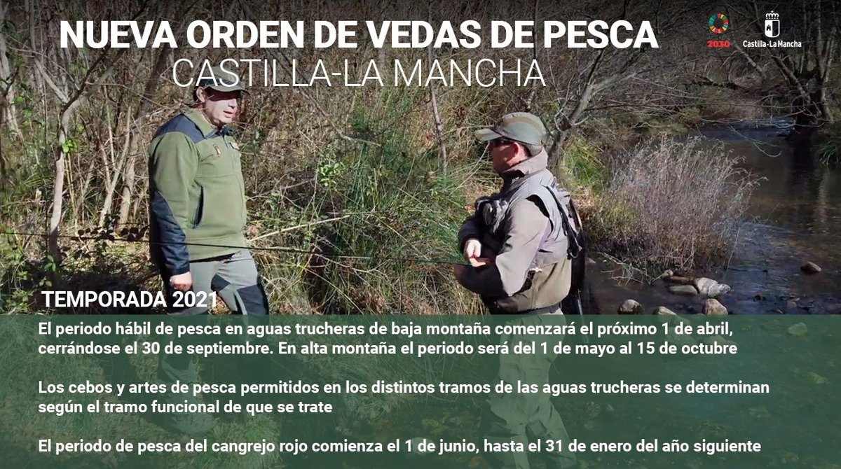 El Diario Oficial de Castilla-La Mancha ha publicado la Orden de la Consejería de Desarrollo Sostenible de Vedas de Pesca de 2021. La actual situación de la COVID-19, si bien no implica necesariamente una situación de riesgo para la pesca cuando se practica de forma individual, sí puedo serlo en actividades colectivas como la celebración de concursos, por lo que se ha puesto a disposición del colectivo de pescadores un protocolo COVID-19 de obligaciones y recomendaciones de prevención e higiene para la actividad pesquera en Castilla-La Mancha disponible en la web.