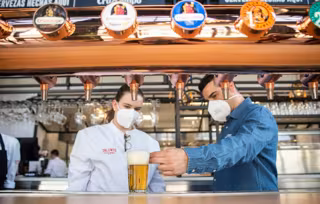Dos camareros sirviendo una cerveza Cruzcampo en su establecimiento. - CRUZCAMPO