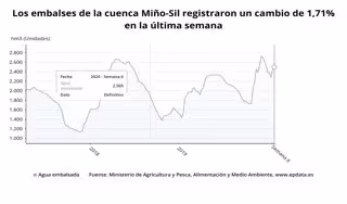 En concreto, este avance viene por la bajada de 24 hectómetros cúbicos de la reserva del Miño-Sil, que se sitúa en 2.481; lo que supone el 81,9% de su capacidad.
