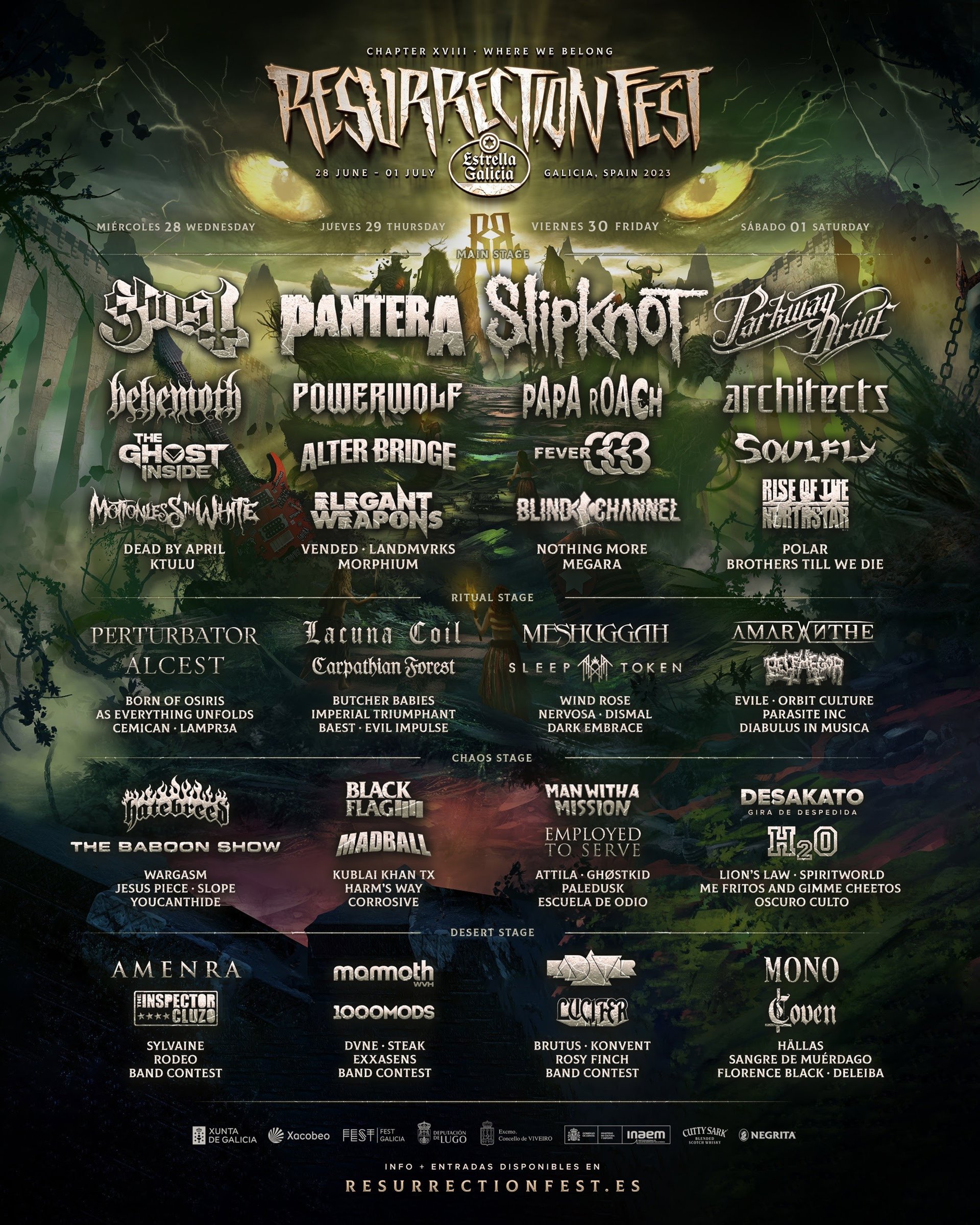 O Resurrection Fest Estrella Galicia anunciou este martes o seu cartel por días, a primeira edición na que o festival contará con catro xornadas de música, encabezado por Parkway Drive, Ghost, Pantera e Slipknot.