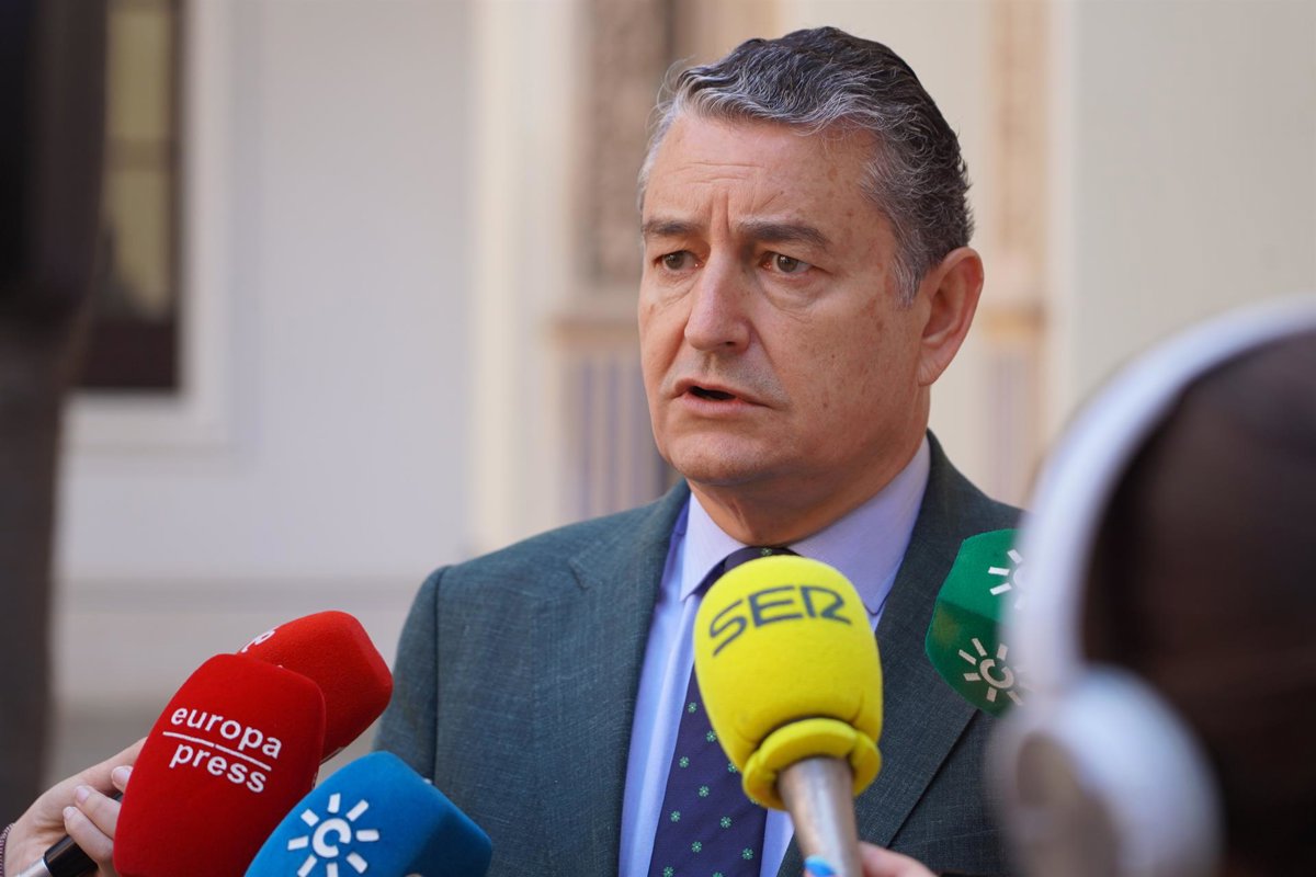 El consejero de la Presidencia, Interior, Diálogo Social y Simplificación Administrativa, Antonio Sanz atiende a los medios de comunicación, a 12 de mayo de 2023 en Sevilla, (Andalucía, España). El consejero de la Presidencia, Interior, Diálogo Social y - Francisco J. Olmo - Europa Press