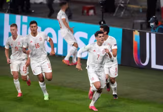 06 July 2021, United Kingdom, London: Spain's Alvaro Morata (R) celebrates scoring his side's first goal with teammates during the UEFA EURO 2020 semi final soccer match between Italy and Spain at Wembley Stadium. Photo: Nick Potts/PA Wire/dpa - Nick Potts/PA Wire/dpa