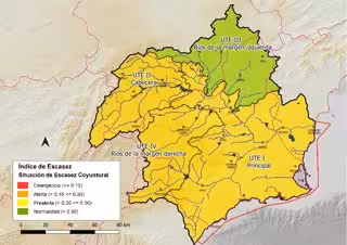 Por zonas, la Unidad Territorial (UTE) principal, margen derecha y la cabecera están en situación de prealerta, mientras que la margen izquierda está en normalidad en relación al índice de escasez coyuntural.
