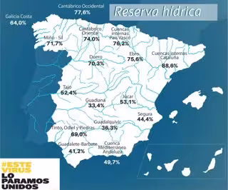 Además, el Tajo está al 52,4 por ciento; Guadiana, al 33,4 por ciento; Tinto, Odiel y Piedras está al 69 por ciento; Guadalete-Barbate, al 41,2 por ciento; Guadalquivir, al 36,3 por ciento; la cuenca Mediterránea Andaluza, al 49,7 por ciento; Segura, al 44,4 por ciento; Júcar, al 53,1 por ciento; Ebro, al 75,6 por ciento y las cuencas internas de Cataluña, al 88,6 por ciento.