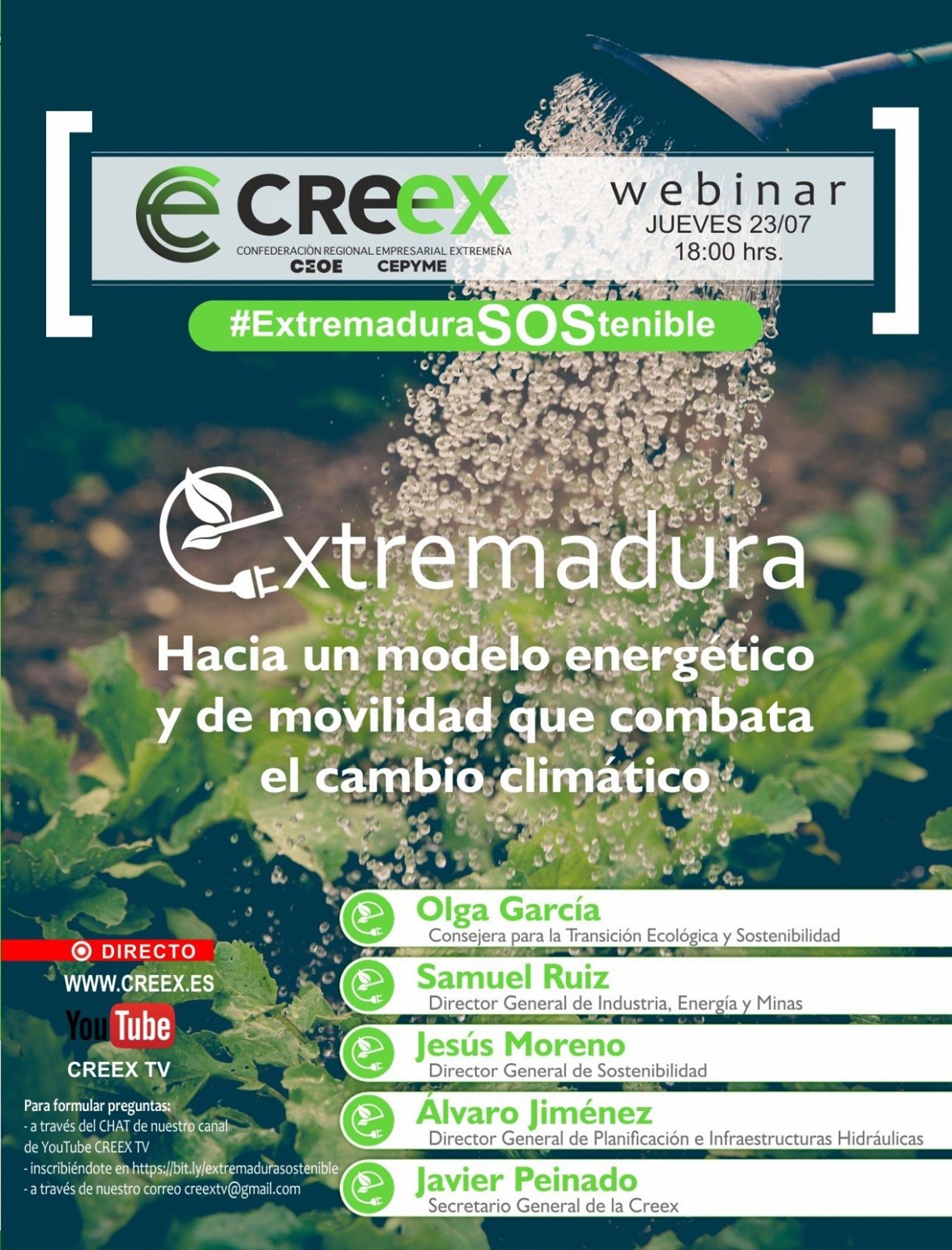 La Confederación Regional Empresarial Extremeña (Creex) ha organizado para este jueves, día 23, a las 18,00 horas, un nuevo webinar bajo el título '#ExtremaduraSOStenible: Hacia un modelo energético y de movilidad que combata el cambio climático'.