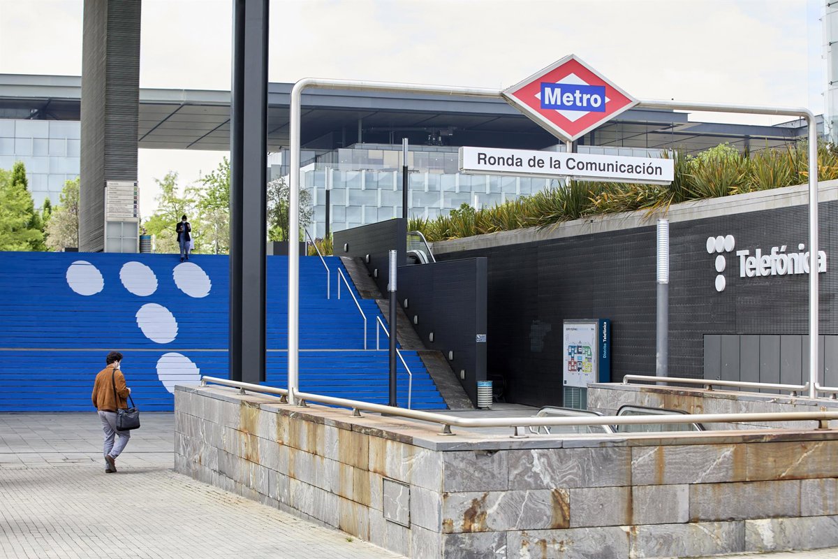 Metro al lado del edificio de la sede de Telefónica, a 27 de abril de 2021, en Madrid, (España). Telefónica ha cambiado su imagen por primera vez en más de dos décadas con un nuevo logo que rememora las míticas cabinas telefónicas. Su nueva imagen, que - Jesús Hellín - Europa Press