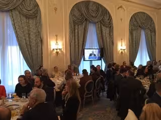 Un total de 30 personas sin hogar han desayunado este martes 7 de febrero en el Hotel Ritz con motivo de la participación del presidente de la ONG Mensajeros de la Paz, el padre Ángel García, en un desayuno informativo.