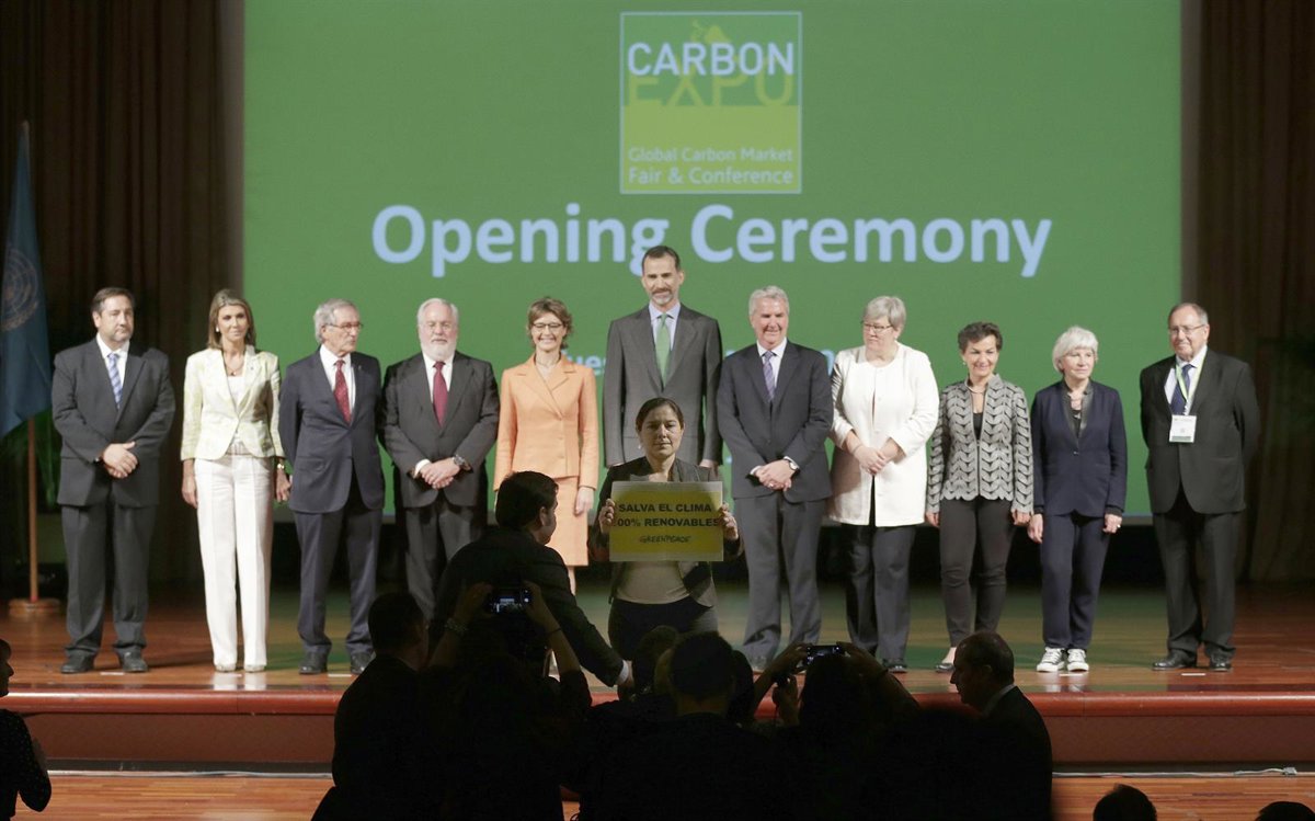 Dos activistas de la organización ecologista Greenpeace han irrumpido este martes en la inauguración del Carbon Expo 2015, que se celebra en el recinto de Montjuïc de Fira Barcelona, donde han mostrado una pequeña pancarta amarilla exigiendo energías renovables con el lema 'Salva el clima. 100% Renovables'.
