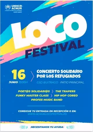 Contra ello, la ONG propone el 'Loco Festival', en el que puede participar cualquier centro educativo de Primaria o Secundaria de España, ya sea público, privado o concertado. La inscripción se realiza en la web y los centros inscritos recibirán materiales para trabajar en las aulas todos los aspectos del proyecto: desde la sensibilización sobre la situación de las personas refugiadas y la labor de ACNUR, a los detalles técnicos de la organización de un festival de este tipo.