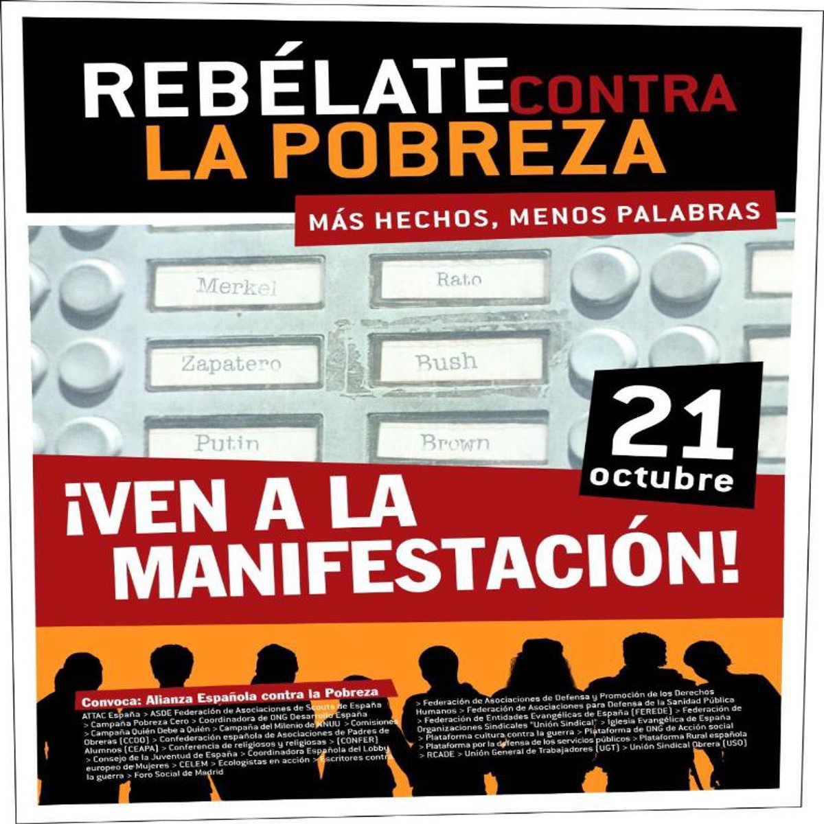 La Alianza Española Contra la Pobreza insta a la sociedad española a participar este fin de semana en las manifestaciones convocadas en más de cuarenta ciudades españolas para exigir "que la lucha contra la pobreza forme parte de la agenda política y de sus programas electorales" y demandar "una mayor y mejor Ayuda Oficial al Desarrollo (AOD), la cancelación de la deuda externa de los países pobres y un cambio en las actuales normas del comercio internacional".