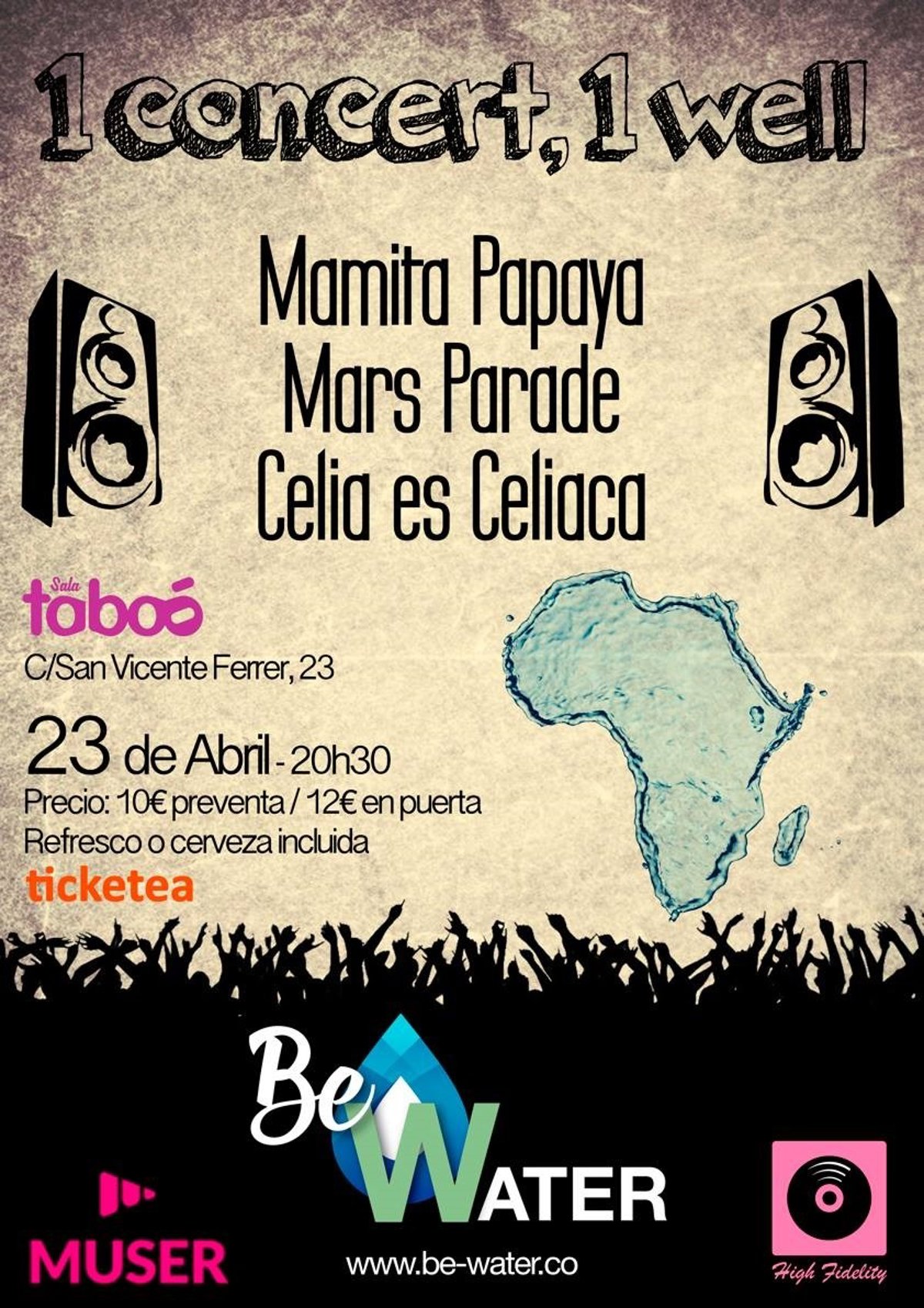 Be water ONG organiza este sábado 23 de abril a las 20:30 horas en la Sala Taboo de Madrid un concierto solidario para recaudar dinero con el objetivo de construir un pozo de agua potable en Etiopía, según informa la organización.