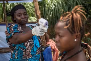 Una mujer realiza un control de detección del ébola en República Democrática del Congo con una pistola térmica - CÁRITAS - Archivo