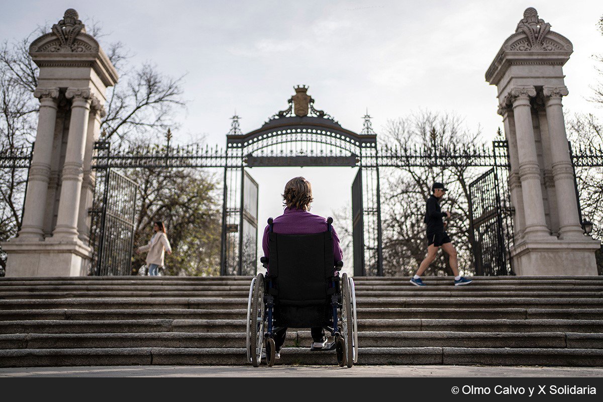 Entre las fotografías que integran la muestra, titulada '1 millón de razones para marcar la X Solidaria', destacan las del 'Programa estratégico de promoción de la autonomía personal de las personas con discapacidad física y orgánica' de COCEMFE, en las que se puede ver a Cristina frente a la puerta de España del parque de El Retiro, una entrada que tiene una escalinata totalmente inaccesible para una persona con movilidad reducida.