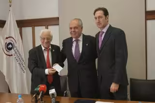 El presidente de la Fundación Universitaria de Las Palmas (FULP), Manuel Campos, y el Padre Ángel García presentaron en la capital grancanaria el 'Proyecto de Cooperación para la creación de una ludoteca para los niños de Benin', que será creada en uno de los centros recuperados por Mensajeros de la Paz en este país africano, y de la que se beneficiarán más de 150 niños, además de sus familias.