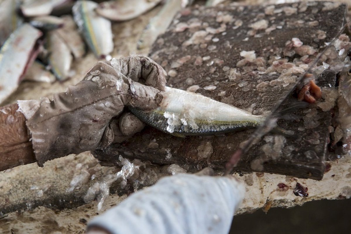 Pinchaua, morenillo, picudillo, ojo rojo y chicharro. Son los peces que bajo la etiqueta 'sardina' se limpian, enhielan y envían a la envasadora, una fábrica situada a escasos kilómetros donde se encargan del enlatado o congelado del producto. Con el arrastre, se cuelan en las redes otras especies, que las trabajadoras apartan cuidadosamente en un montón: si sirven para consumo, se las cenarán los empleados. Las sobras se procesan aparte para fabricar harinas. Aquí no se tira nada.