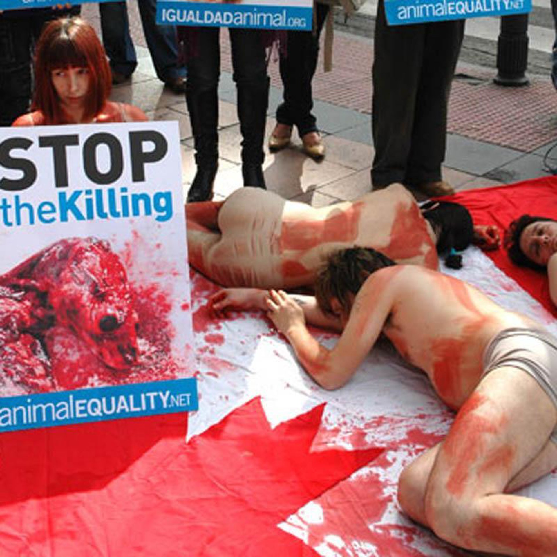 Semidesnudos y cubiertos de pintura roja, un grupo de activistas de la ONG se tumbaron sobre una bandera de Canadá mientras otros esgrimían pancartas con lemas como "Basta de matanzas - Stop especismo - Igualdad Animal". En paralelo, otros dos integrantes de la ONG irrumpieron en la embajada con carteles manchados de rojo y al grito de "Canadá, vergüenza das" hasta ser expulsados del edificio, según informó Igualdad Animal en un comunicado de prensa.