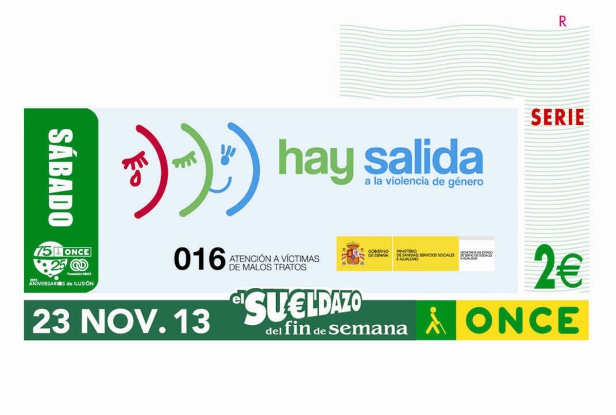 La ONCE dedica el cupón del sábado 23 de noviembre a la campaña contra la violencia de género por lo que, de este modo, la organización se suma a la lucha contra los malos tratos a la mujer, en línea con la iniciativa 'Hay salida a la violencia de género' que se desarrolla en toda España.